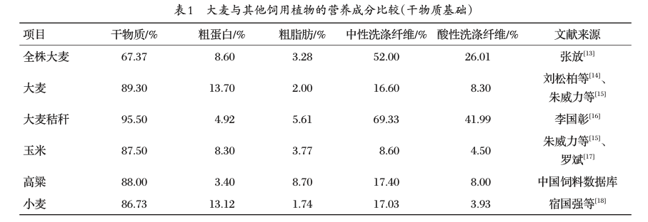 大麥穩定性好、耐儲存、適口性優,具有較高的營養價值。大麥中的蛋白質、干物質等含量均高于玉米,蘇氨酸、甘氨酸、纈氨酸和精氨酸等氨基酸的含量也高于玉米。大麥中較高的蛋白水平有助于優化動物的日糧結構,可減少豆粕、氨基酸等的添加量。大麥中還含有豐富的維生素,如VE 48.0 mg/kg、VB114.1 mg/kg、VB2 14.0 mg/kg、煙酸 87.0 mg/kg 和VB6 19.3 mg/kg。但大麥中粗纖維含量較高,中性和酸性洗滌纖維含量約為玉米的2倍,導致大麥作為單胃動物飼料的飼喂效果較差。大麥中的粗纖維主要存在于麩皮中。大麥的營養物質消化率低于玉米,飼喂價值約為玉米的 90%,原因為大麥中含有較多的抗營養因子,阻礙營養物質的消化吸收。大麥中主要的抗營養因子是可溶性非淀粉多糖 (NSP),包括β-葡聚糖4.0%~8.0%、木聚糖 6.6% 和纖維素4.0%~8.0%??扇苄訬SP在動物胃腸道中不僅可以提高食糜黏稠性,降低食糜流動速度,而且能夠吸收大量水分,并吸附離子 (Ca2+、Zn2+和Na+等) 和其他營養物質,形成營養屏障影響代謝,改變腸道菌群結構,最終降低飼料能量。因此,大麥是一種優質的飼料原料,但需要對其含有的抗營養因子進行處理才能提高大麥的飼喂效果。 大麥與其他飼用植物的營養成分比較見表 1。