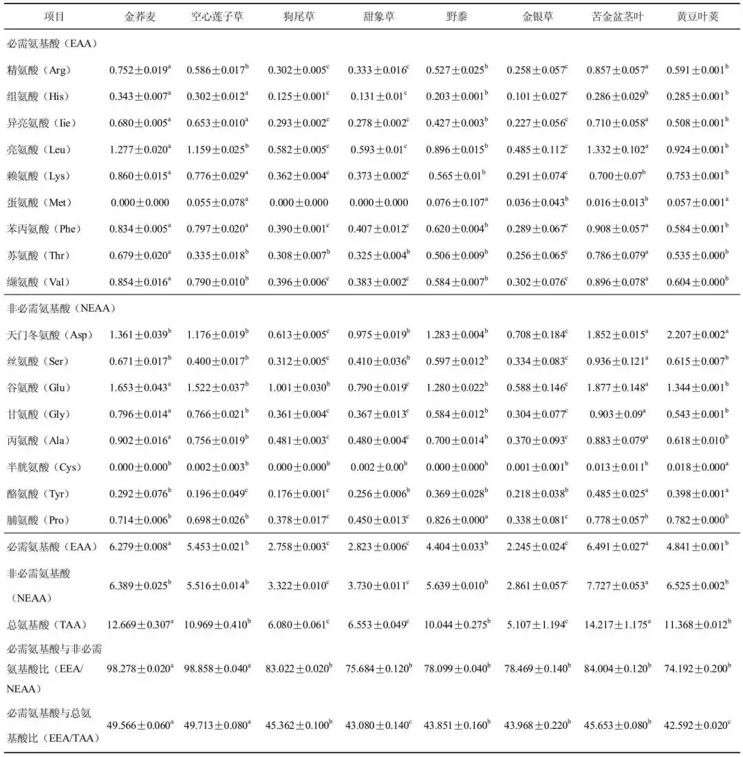氨基酸是構成動物所需蛋白質的基本原料,其中必需氨基酸是動物機體所必須但自身不能合成或合成量不能滿足代謝需求、需從飼料中獲取的重要營養元素,因此飼料中氨基酸的含量、組成特點和比例直接影響飼料品質和動物的生長。本試驗測定的8 種青飼料中,總氨基酸和必需氨基酸含量最高的為苦金盆莖葉,其次為金蕎麥、空心蓮子草和黃豆葉莢。賴氨酸為飼料中第一限制性氨基酸,本試驗中含量最高的為金蕎麥,其次為空心蓮子草、苦金盆莖葉和黃豆葉莢。