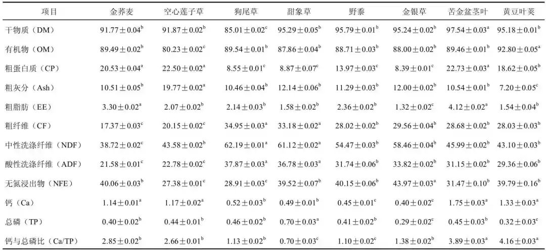 據文獻報道,金蕎麥的CP 范圍為17.54%~25.81% ,狗尾草的CP 含量為7.78%~8.38% ,Ash 含量為9.66%~11.54%,NFE的含量為38.28%~45.68% ,Ca 的含量為0.47%~0.96%,P 的含量為0.24%~0.44%。該試驗中金蕎麥的CP 含量為8.39%~22.73%,金蕎麥、空心蓮子草和苦金盆莖葉的CP 含量大于20%,金蕎麥、空心蓮子草、野黍、金銀草、苦金盆莖葉、黃豆葉莢的CF 含量小于30%。除空心蓮子草的Ash 含量外,其余均為7.2%~12.14%,NFE 的含量為27.38%~43.97%,EE 含量均低于5%。