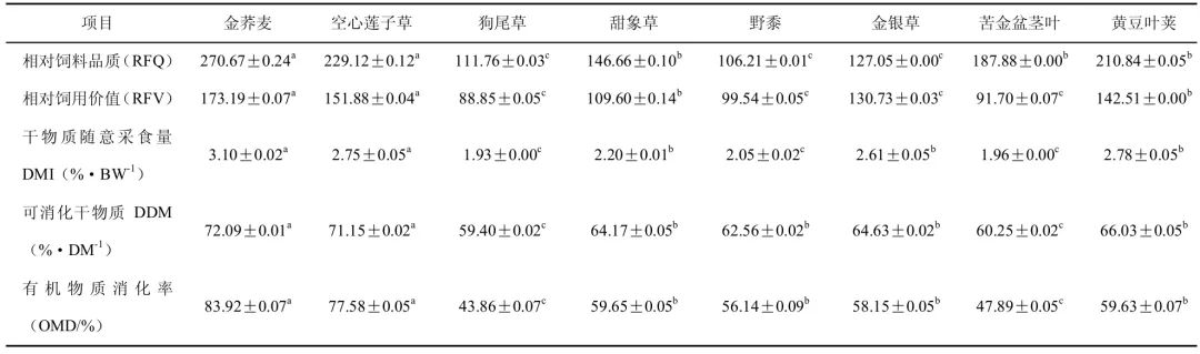 由表3 可知,金蕎麥和空心蓮子草的RFQ、RFV、DMI、DDM、OMD 均顯著高于其他6 種(p<0.05)