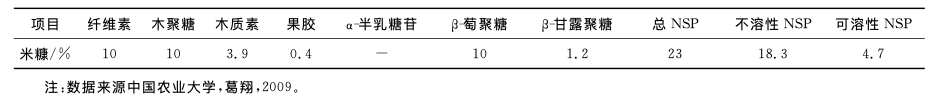 米糠中各抗營養因子含量見表2.除此之外,米糠中還含有熱敏性的抗胰蛋白酶抑制因子和植酸等,這些抗營養因子不僅阻礙蛋白質的消化吸收,而且還與體內營養物質螯合,損害動物健康,阻礙營養素的消化及吸收,降低其飼料利用率。因此,合理使用米糠的同時如何降低其抗營養因子含量是米糠在畜禽應用中應該考慮的問題 。