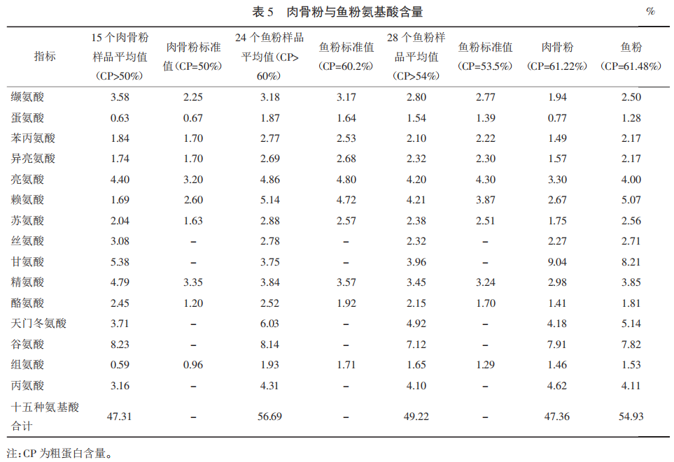 由表5可知,魚粉所含有的必需氨基酸含量高,肉骨粉的賴氨酸、蛋氨酸和組氨酸含量低于魚粉,谷氨酸、丙氨酸、甘氨酸略高于魚粉。畜禽所必需攝取的蛋氨酸含量,魚粉含量為1.28%,肉骨粉含量為 0.77%,魚粉蛋氨酸含量是肉骨粉蛋氨酸含量的1.6倍;魚粉賴氨酸含量為5.07%,肉骨粉賴氨酸含量為2.67%,魚粉賴氨酸含量是肉骨粉賴氨酸含量的1.9倍?,F今魚粉資源匱乏,從肉骨粉氨基酸組成來看,只要適當添加賴氨酸及蛋氨酸,均衡肉骨粉的氨基酸組成,肉骨粉將會成為理想的代魚粉資源。