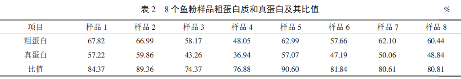 由表2可知,在抽取的8個樣品的檢測結果中,不合格的為樣品3.其比值僅為74.37%,可判斷該魚粉中摻有水溶性非蛋白氮物質。