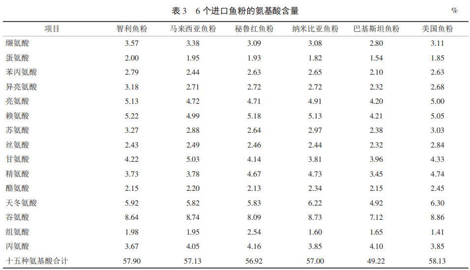 由表3可知,進口魚粉蘇氨酸的含量一般在2.38%~3.27%;氨酸的含量變化范圍較大,為2.80%~3.57%,其含量隨魚粉的生產中原料魚種類的不同而不同;蛋氨酸的含量為1.54%~2.00%,各種魚粉的原料不同其蛋氨酸含量差別也較大;賴氨酸的含量為4.21%~5.22%,隨魚粉來源魚種的不同也有差異;組氨酸的含量為1.41%~2.54%,組氨酸若過高,其新鮮度就差,一般組氨酸在魚粉中含量為1.70%左右;精氨酸的含量為 3.45%~4.73%。