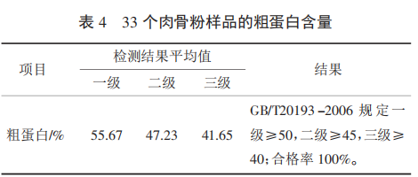在實際檢測中肉骨粉的粗蛋白一般在 40%~50%,國產肉骨粉的粗蛋白在40%左右,此次抽取樣品的粗蛋白質含量均符合要求。從表4中可以看出肉骨粉蛋白質含量在三級以下的粗蛋白質的平均值可以達到41.65%。