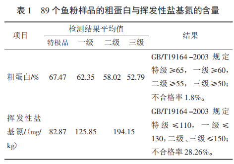 揮發性鹽基氮是氨基酸降解的產物,其含量越高,表明氨基酸(特別是蛋氨酸和酪氨酸) 被破壞的越多,魚粉的營養價值降低幅度越大。但揮發性鹽基氮只適用于魚粉中微生物繁殖初期的檢測。由表1可知,魚粉揮發性鹽基氮不合格率為28.26%,二級、三級魚粉的揮發性鹽基氮平均值較標準值偏高。
