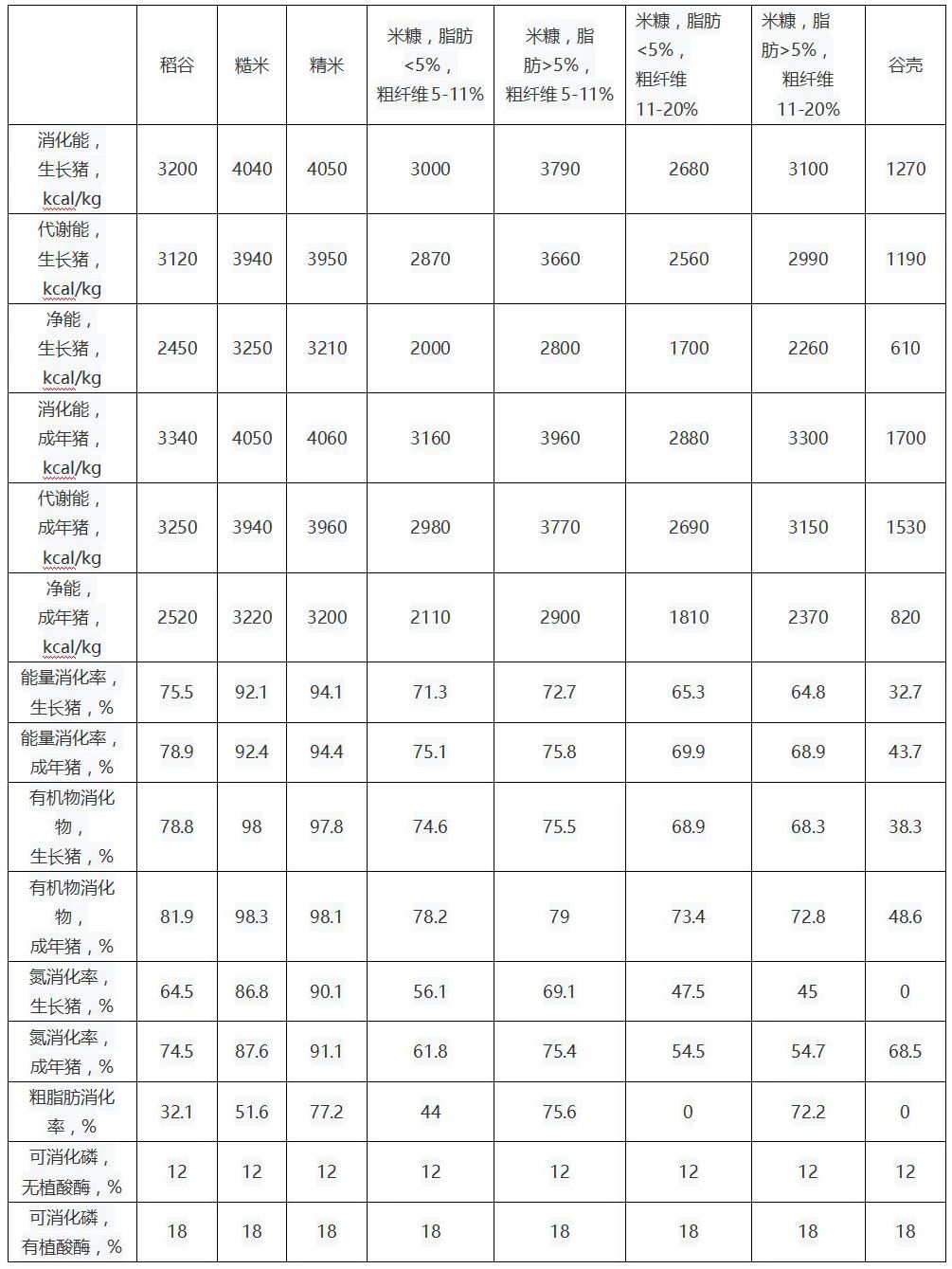 表4:稻谷及相關產品對豬的飼喂價值(干物質)