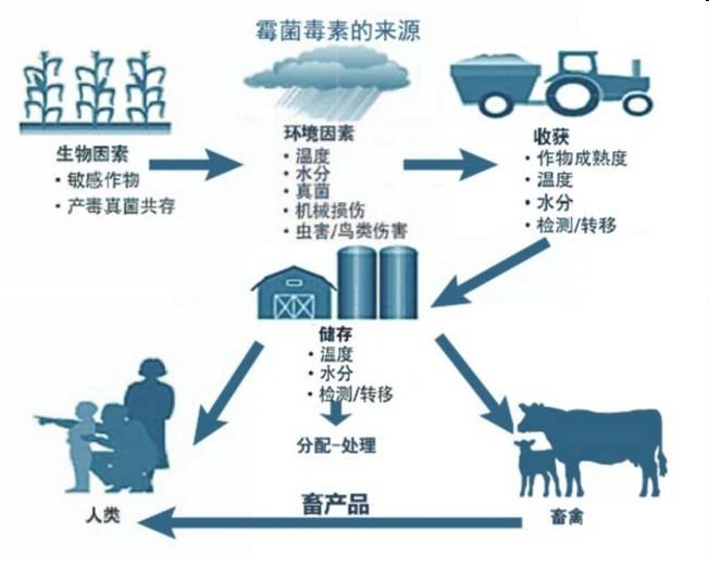 霉菌也會降低玉米適口性和營養價值,但是其危害作用卻遠遠小于其次級代謝產物——霉菌毒素。同一種霉菌可以產生多種不同的霉菌毒素;不同的霉菌也可以產生同一種霉菌毒素。目前存在的霉菌毒素有300多種,它們在玉米的生長、收獲及儲存期間均可能產生。常說的田間霉菌毒素和倉儲霉菌毒素在實際生產中分的并不嚴格。