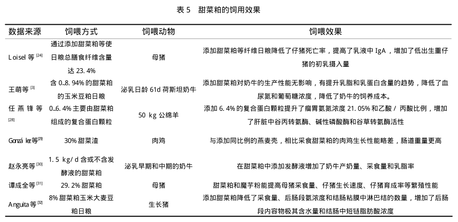 甜菜粕是一種高纖維的飼用原料,在反芻動物中的應用已經比較普遍,但在單胃動物中還有待推廣。一些關于甜菜粕飼用價值的研究見表 5。