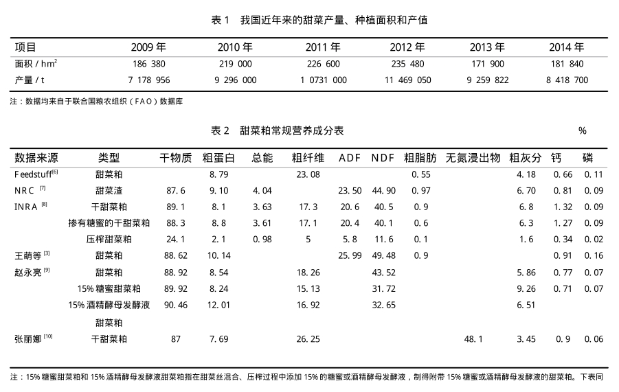 甜菜是我國第二大糖料作物,甜菜糖產量占食糖總產量的10%左右。甜菜最主要的用途是制糖,而在其加工過程中會產生諸多的甜菜加工副產物。目前,由于社會各界對這些副產物重視不足,收集、保藏和利用不當,造成了資源的嚴重浪費。本文對甜菜加工副產物,尤其是甜菜粕的營養價值及在飼料方面的應用效果作了簡單的介紹和總結,旨在為甜菜粕在飼料生產中的應用提供借鑒。