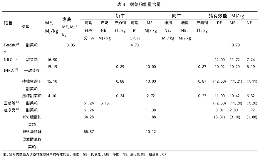 3.2 甜菜粕顆粒 甜菜粕顆粒是將濕甜菜粕壓榨脫水、烘干和制粒形成的副產物,每 100t甜菜大約可產出甜菜粕顆粒 6t [12]。近年來,由于其易保存方便運輸、養分含量高等特性逐漸成為甜菜粕飼用的重要方式。此外,甜菜粕顆粒在制造過程中還可以與甜菜廢蜜結合,改善顆粒適口性,增加能量含量。
