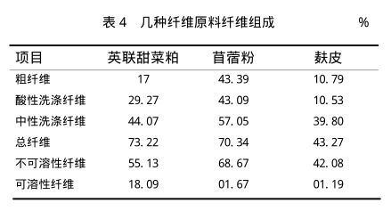 從表2和表3中不難發現,甜菜粕中蛋白水平較低,纖維含量較高。姚庭香[4]提出,甜菜粕中果膠含量可達甜菜粕干重的19.6%。這一特性也使甜菜粕成為提取果膠的重要原料之一。果膠具有良好的乳化、增稠、穩定和膠凝作用,在各產業中均有應用。除去果膠外,甜菜粕中還富含甜菜堿。甜菜堿作為一種甲基供體,與蛋氨酸和膽堿有著類似的營養作用,有改善母豬生產性能、調節脂代謝等功能。孫海清[5] 分析了包括甜菜粕在內的幾種纖維原料中的纖維物質組成(見表4),并測試了其物化特性以及飼用效果后發現,甜菜粕的最大產氣量主要來自于其慢速可發酵部分,且甜菜粕的最大產氣量顯著高于其他幾種纖維源,同時,甜菜粕在發酵過程中產生的短鏈脂肪酸濃度要顯著高于不溶性纖維原料。