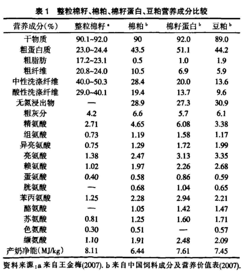 1 整粒棉籽和棉粕的營養價值