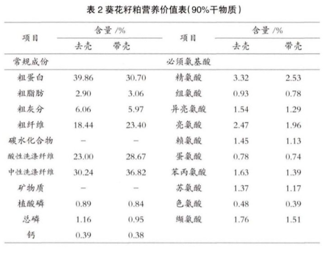 葵花籽粕主要被用作畜禽的蛋白質飼料原料,有帶殼和去殼之別。其常規營養成分及必需氨基酸含量見表2。由表中數據可以看出,去殼葵花籽粕與帶殼葵花籽粕的營養存在差異。孝延文等(1983)就已經研究報告,葵花籽仁中不同蛋白質的含量分別為:水溶蛋白 9.8%、鹽溶蛋白 10.8%堿溶蛋白 4.6%、醇溶蛋白 1.2%,合計 26.4%;四類蛋白在葵仁蛋白質中占比分別是35%、38.6%、16.4%和 4.2%,合計 94.2%。