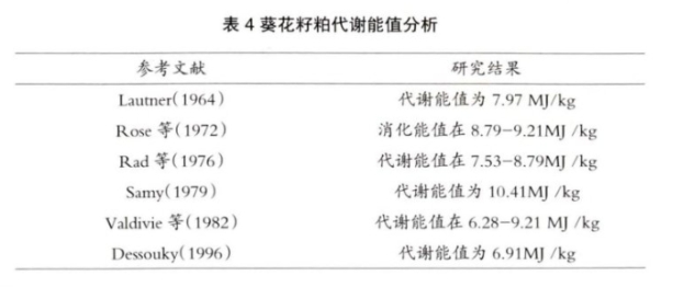 葵花籽粕在雞日糧中的應用主要集中在肉雞上。我們知道,飼料原料的有效能值是衡量其在肉雞日糧中應用的營養價值的重要參考指標。不同的研究學者陸續對葵花籽粕的代謝能值進行了驗證并得出結論,但是存在一定差異。由表4可以看出,總體上,各學者測定的葵花籽粕代謝能值在6.28~10.46MJ/kg范圍內,集中分布在 7.95~8.19MJ/kg范圍。