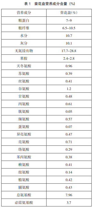 葵花盤的營養價值可以與玉米、小麥等精飼料相媲美,因此經常被用于牲畜飼料??ūP富含多種營養成分,其部分營養成分含量見表1。