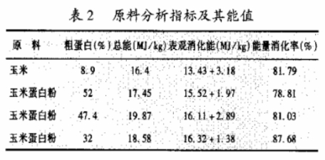 玉米蛋白粉的蛋白含量高低與豬的表觀消化能值直接相關,能量與蛋白比例適宜或必需氨基酸與非必需氨基酸較平衡的原料有較高的能量消化率郭亮(2000)在豬的基礎飼料中添加蛋白含量不同的玉米蛋白粉(CP:52%東北產,47.4%、32%北京產),添加量分別為20%、25%、30%,測定豬的消化能,試驗結果表明(表2),含32%粗蛋白的玉米蛋白粉表觀消化能較高,其原因可能是其能量與蛋白比例比較適官。