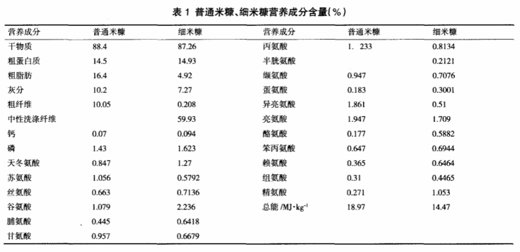 米糠根據它的加工方式可分為普通米糠、脫脂米糠和細米糠。普通米糠含88.4%的干物質,14.5%的初蛋白、10.05%的粗纖維和10.2%的灰分;脫脂米糠含 15.1%粗蛋白、1.75%乙醚抽取物13.1%粗纖維和13.0%灰分;細米糠的營養成分比較高,含有14.93%的粗蛋白,遠遠高于玉米(一級玉米8.7%),且價格低于玉米和小麥麩,還含有16.4%的粗脂肪、7.27%的灰分和0.208%的粗纖維,是一種很好的能量飼料。米糠不含膽固醇,其蛋白質的氨基酸種類齊全,營養品質可與雞蛋蛋白媲美,而且米糠所含脂肪主要為不飽和脂肪酸必需脂肪酸含量達47%,還含有70多種抗氧化成分。因此,米糠在國外被譽為“天賜營養源”。具體營養成分見上表1。