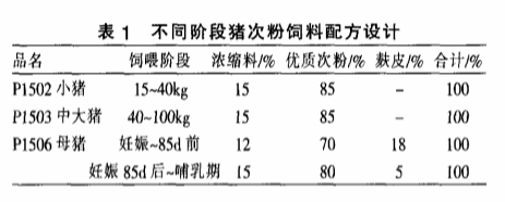 根據豬不同階段的營養需要量、次粉中營養元素含量及用戶便于配制和不易出錯的原則,精心設計出配方(表1)。