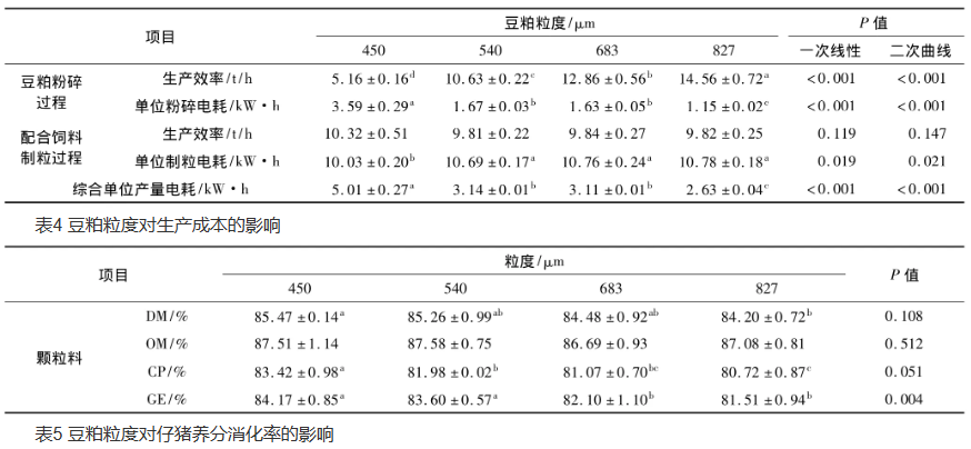 豆粕粒度減小,粉狀配合飼料混合均勻度提高,顆粒料的硬度、穩定度(PDI)明顯提高,但對含粉率無影響。隨豆粕粒度的減小,粉碎過程中生產效率明顯降低,單位產量電耗明顯增加,但對制粒過程影響不大;降低豆粕粉碎粒度,可顯著提高仔豬蛋白質消化率、能量消化率,但對干物質消化率和有機物質消化率無影響。綜合粒度對飼料物理指標、生產成本及對仔豬消化率的進行評定,540 μm為仔豬顆粒料中豆粕的最適粉碎粒度,即1.5 mm篩孔孔徑為粉碎豆粕的最佳篩片孔徑。
