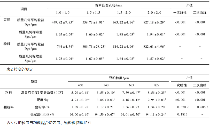 飼料原料粒度的不同是影響粉狀配合飼料混合均勻度的一個主要因素,對顆粒料物理質量的影響主要體現在顆粒飼料的硬度、含粉率和穩定度(PDI)3個方面。