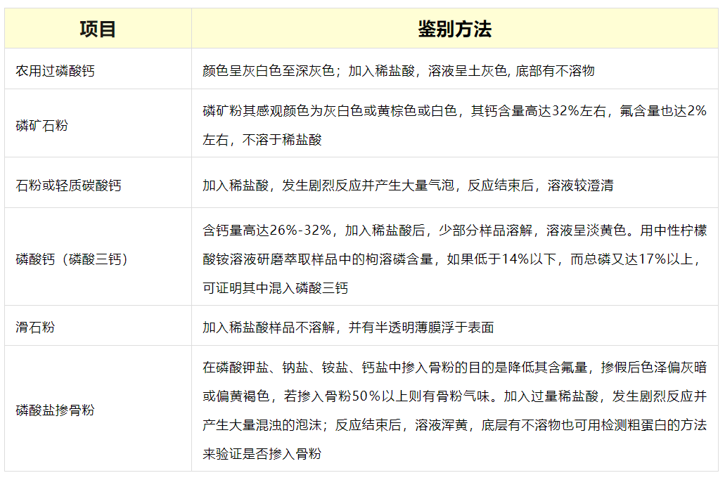 a、飼料級磷酸鹽的質量標準中最重要的理化指標是磷。為了滿足磷的要求,摻雜造假問題也出現了。常見的造假及鑒定方法: