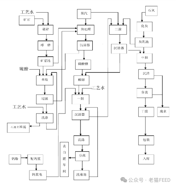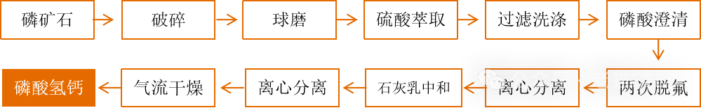 目前國內飼料級磷酸氫鈣生產普遍采用濕法磷酸法(而絕大部分生產裝置是硫酸法工藝),即H2S04 或HCL分解磷礦石,經渣液分離,得到低濃度的萃取磷酸,通過脫氟工藝,用石灰乳中和沉淀出磷酸氫鈣,經除雜烘干,粉碎處理即可。當然還有利用植物生產蛋白飼料、肌醇時聯產的磷酸氫鈣以及骨質磷酸氫鈣等,由于其存在穩定性和安全性問題,實際應用受限。