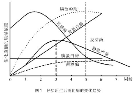 仔豬斷奶時消化器官的結構和功能發育還不完善,胃腸容積小,運動機能弱,排空速度快。許多研究表明:仔豬斷奶后消化系統可發生顯著變化:主要表現為小腸出現嚴重的絨毛萎縮、腺窩變深、吸收障礙、腸黏膜淋巴細胞增生和隱窩細胞有絲分裂速度加快。消化系統發育不完善,需要補充內源酶,如:蛋白酶和糖類酶。另外,由于斷奶應激造成消化系統素亂,消化酶分泌不足。