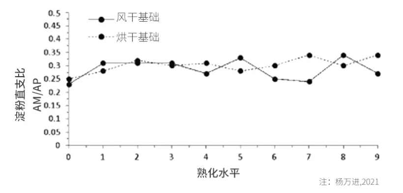 同時加工方式也會導致直/支比變化,每年東北地區新玉米收獲后多采用烘干干燥模式,烘干效率高,但這個方式會造成直鏈淀粉升高,降低淀粉消化率。