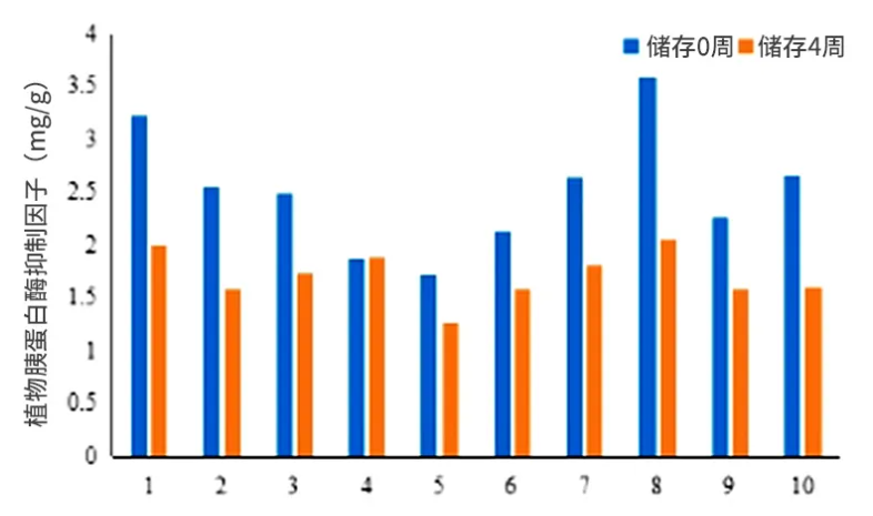胰 蛋白酶抑制劑是植物防御蛋白的一種,為植物性飼料原料中的抗營養因子。胰蛋白酶抑制劑可與畜禽動物體內胰蛋白酶結合,形成不可逆且無酶活性的復合物,從而抑制動物對蛋白的消化、吸收和利用的能力。新收獲的玉米在儲存4周后,胰蛋白酶抑制劑因子顯著降低,平均降幅在1/3。