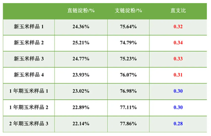 淀粉直/支比是反映淀粉消化性的重要指標,體外模擬試驗一致表明,淀粉支/直比與淀粉消化率呈正相關。不同品種的玉米,兩者比例不一致,新玉米在整體上直鏈淀粉含量高,形成晶體區域大,淀粉消化率低;