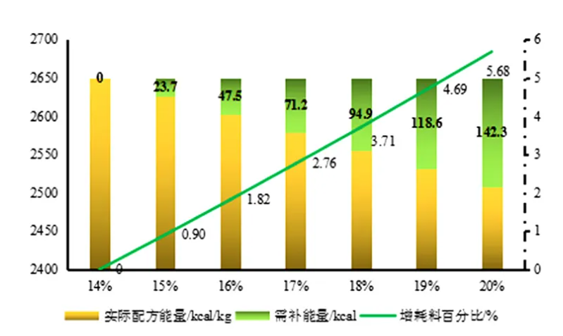飼料日糧中使用高水分的玉米,會稀釋業今三以降、能蛋比失衡。以蛋雞日糧為例,下圖是不同含水量的新玉米在固定添加比例情況下日糧的代謝能值,實際應用中需要對日糧的能值進行額外補充。