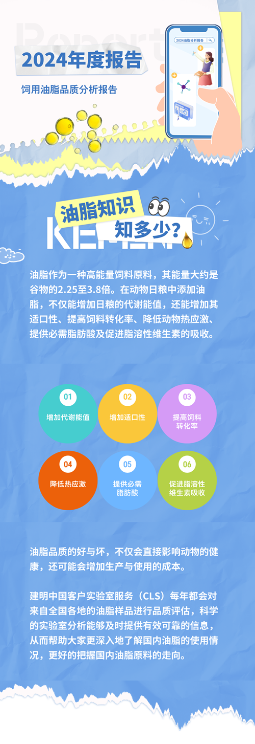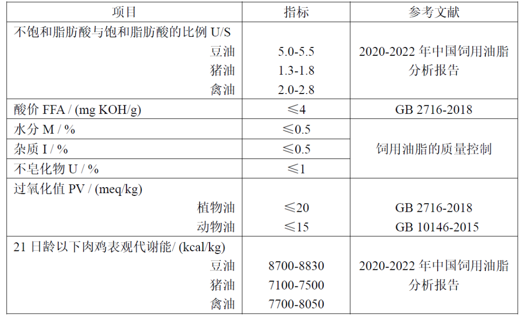 2024年建明CLS實驗室對飼用油脂的評估項目包括脂肪酸譜、不飽和脂肪酸與飽和脂肪酸的比例(U/S)、酸價(FFA)、水分(M)、雜質(I)、不皂化物(U)和過氧化值(PV),再通過Wiseman方程計算肉雞的表觀代謝能和豬的消化能。