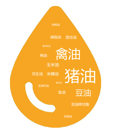 還有少量的玉米油、米糠油、魚油、棉籽油、花生油、磷脂油、豆油單甘酯、亞麻籽油、棕櫚油、花椒油、菜籽油、葵花籽油和混合油脂(圖1)。