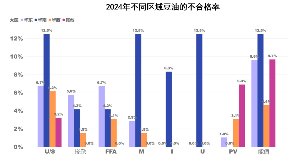 ② 華南區域豆油樣品的水分、雜質和不皂化物的超標率較高。
