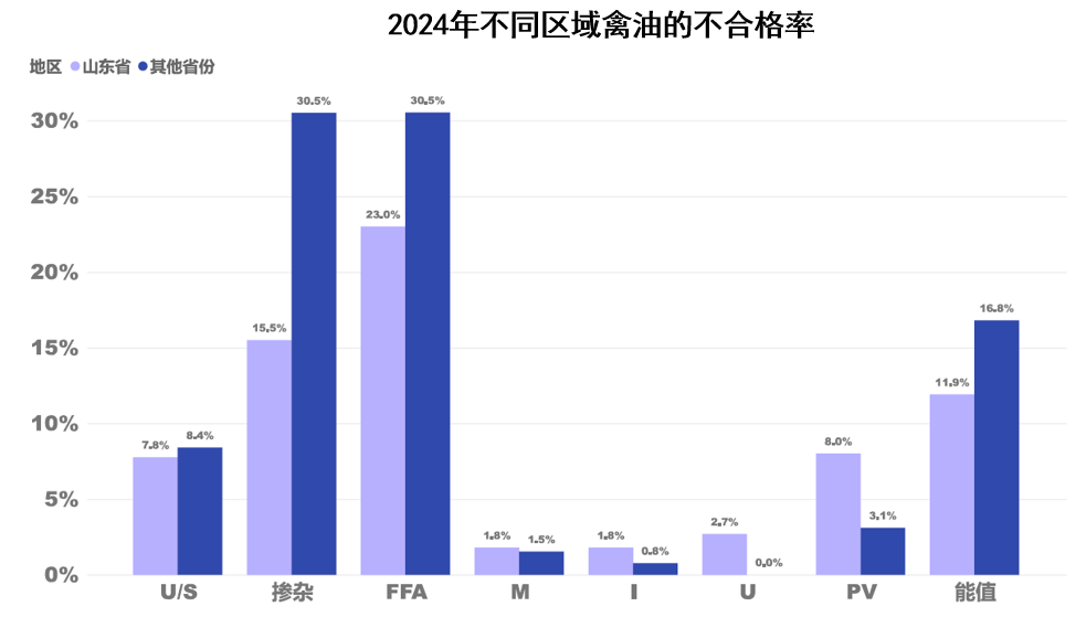 其它省份的禽油樣品雖然不多,但其摻雜的比例比山東省高了15.0%,酸價超標的比例比山東省高了7.5%。