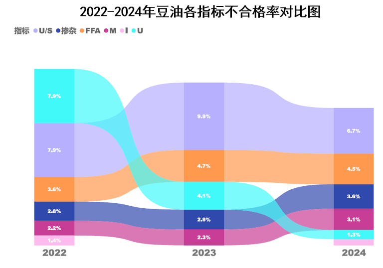 對比2022年和2023年的數據,2024年豆油樣品的質量持續表現良好,所有評估項目的合格率都在90%以上(圖3)。