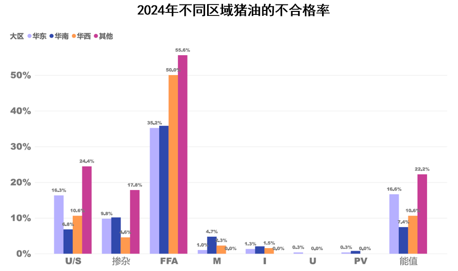 U/S值不合格率和摻雜比例較高的是華東區域和華南區域。