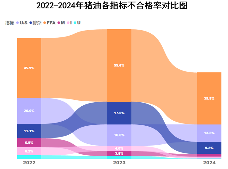 2022年、2023年和2024年摻入豆油的比例分別0.4%、0.6%和2.2%,有逐年升高的趨勢;摻入棕櫚油的比例分別為2.5%、2.3%和0.2%,有逐年下降的趨勢;摻入豬油的比例分別為9.1%、5.2%和2.6%,有逐年下降的趨勢。