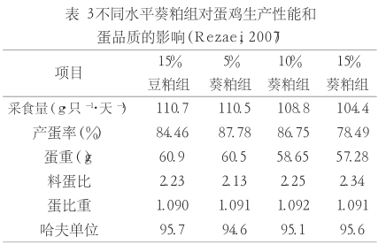 Rezaei等(2007)研究了添加不同水平的葵粕對蛋雞生產性能的影響,對照組為15%豆粕,實驗結果表明,日糧中添加 10%葵粕不會影響蛋雞的生產性能,由表3可看出,蛋雞的產蛋率還提高了 2.29%,蛋重略有下降,蛋品質沒有影響;添加 15%葵粕,由于日糧粗纖維過高,反而影響了蛋雞的生產性能,并建議在蛋雞日糧配方中可添加5%~10%葵粕。Kamnajeewa等(1989)在補充油脂的情況下,在蛋雞日糧中添加0、5.79%、12.19%和 18.97%脫皮葵粕,試驗結果表明,對照組和實驗組的產蛋率、蛋殼質量和飼料轉化率無明顯差異。這表明,脫皮高蛋白葵粕在蛋雞日糧中的添加量可以適當提高。奧特奇公司試驗研究表明,用葵粕替代蛋雞日糧中15%~20%的豆粕,并補充適量的蛋白酶和木聚糖酶,并不影響蛋雞的生產性能。