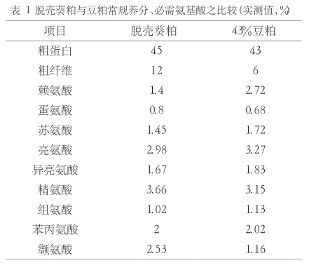由表1可以看出,脫殼葵粕的粗蛋白高于豆粕,除賴氨酸外,葵粕其他必需氨基酸基本與豆粕相當,甚至高于豆粕,尤其是蛋氨酸含量明顯高于普通豆粕中的含量,在應用葵粕于蛋雞飼料中,可節約部分蛋氨酸??芍写掷w維含量較高,達到12%,是普通豆粕的2倍,在應用葵粕于動物飼料配方時,要控制其添加量,避免因日糧粗纖維過高而影響動物消化率。參考中國飼料成分營養價值表(2008),葵粕的雞代謝能8.49MJ·kg-1,遠低于豆粕的10MJ·kg-1,葵粕的豬消化能10.42MJ·kg-1,也低于豆粕的 14.26MJkg-1,能量較低會影響其在畜禽日糧中的添加比例。