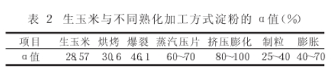 由上述淀粉特性可以看出,淀粉的糊化是在一定的水分和溫度情況下發生的。不同的加工方式得到的淀粉糊化度不一樣。吳孟謙(1995)指出,擠壓膨化玉米淀粉的糊化度可達91%。熊易強(2000)以酶法測定擠壓 (Extrusion)玉米淀粉的糊化度可達80%~100%。其它的玉米熱加工方式如烘烤、爆裂、膨脹等也可使玉米淀粉的糊化度(α值)有一定的提高,其具體數值列于表2。