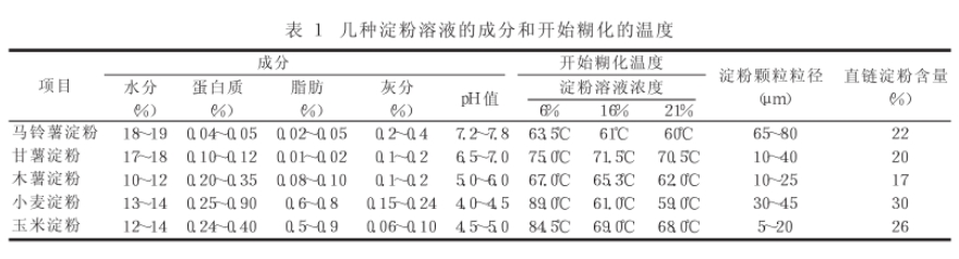 所有的植物淀粉都是由葡萄糖分子單元組合而成,玉米淀粉也不例外,其淀粉顆粒由直鏈淀粉和支鏈淀粉平行密接組成。直鏈淀粉分子排列整齊,支鏈淀粉分子排列不規則。通常直鏈淀粉和支鏈淀粉相互重疊交錯在一起,其間有許多空隙,像一個空的網袋,其葡萄糖聚合長鍵是網線,而脫水葡萄糖分子間的氫鍵是網節。生淀粉不溶于水,一旦加水并加熱就會膨脹,分子結構隨著溫度的升高而變得不穩定,導致最后分子結構因氫鍵斷裂而崩解,這就是淀粉的糊化。不同植物淀粉和不同濃度的淀粉溶液,其開始糊化的溫度不一樣(見表1)。