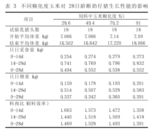 試驗研究表明,玉米淀粉糊化度的提高與養殖效率成正相關關系,尤其是乳豬料。那么究竟多高的糊化度合適?飼料界有的認為70%以上,有的認為80%以上,也有的認為90%以上為好。目前,還沒有統一的認識,但普遍認為應達到85%以上。吳孟謙(1995)報道,要獲得較好的飼養效果,玉米淀粉糊化度要在73%以上,以91%左右的水平較佳。不同糊化度熟玉米粉對28日齡斷奶仔豬之生長性能的影響見表3。由表3的試驗結果獲知,隨玉米淀粉α值由28.6%增至70.2%或91%時,保育前期斷奶后0-14d的只日增重有顯著增加(P<0.05),隨玉米淀粉α值由28.6%增至91%時,飼料效率亦有極顯著改善(P<0.01),但飼料攝食量4組間無顯著性差異。