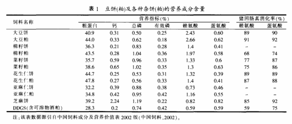 我國每年生產大量雜餅(粕)如棉籽餅(粕)年產量在600萬噸以上,菜籽餅(粕)約300萬噸。隨著育種及浸油加工工藝的不斷完善,目前雜餅(粕)已具有較高的飼用價值。豆餅(粕)及各種雜餅(粕)的營養成分含量見表1。