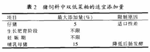 另外,隨著科研的不斷進步,雙低(低葡萄糖硫苷、低芥子酸)優質油菜逐漸成為當今國內外油菜生產的方向。據鄭煒等(2002)報道,當用雙低菜粕完全取代豆粕時,飼糧中可消化氨基酸水平,尤其是賴氨酸和蘇氨酸水平會有所降低,所以早期的飼養中使用雙低菜粕組的試驗豬生長速度要低于豆粕組。但使用雙低菜粕的飼糧在保持可消化氨基酸與豆粕組相同水平時,就能得到與豆粕組相近的生長效率??梢姂秒p低菜籽粕配制豬飼料也需要保持可消化氨基酸的水平,才能達到較為理想的飼喂效果。豬飼料中雙低菜粕的適宜添加量見表2(鄭煒等,2002)。