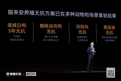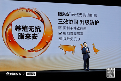 【導語】2025年5月13日晚20:00,新奧農牧“養殖無抗 脂來安”戰略新品云端發布會震撼啟幕,吸引了數萬畜牧從業者在線觀看。會上,新奧農牧董事長賴州文先生正式發布首款養殖無抗功能脂“脂來安”,標志著中國農牧企業在“養殖全程無抗NAE”領域上取得了里程碑式突破,為全球畜牧行業提供了首個基于脂質營養實現養殖全程無抗NAE的中國方案。