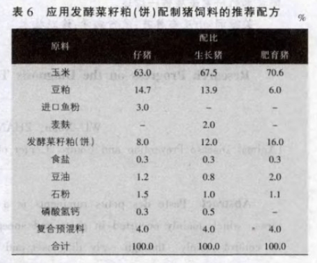 應用發酵菜籽粕(餅)配制不同類型的生豬日糧,可降低飼料配方成本,提高養豬效益。利用發酵菜籽粕(餅 )配制豬配合飼料的推薦配方見表 6。