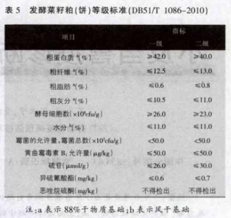 固態發酵飼用菜籽粕(餅)目前還沒有國家標準,四川省畜牧科學研究院制定了《固態發酵飼用菜籽粕(餅)》地方標準(DBSI/T1086-2010),見表5。