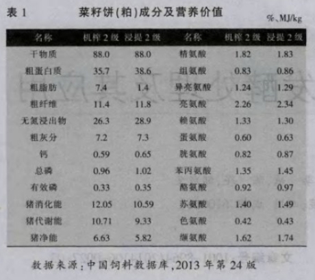 菜籽粕(餅)含有較高的粗蛋白質,約34%~38%;氨基酸組成平衡,含硫氨基酸較多,精氨酸與賴氨酸的比例適宜;粗纖維含量較高,約12%~13%,有效能值較低,豬的消化能為9.41 MJ/kg;碳水化合物為不易消化的淀粉,且含 8%的戊聚糖,鈣、磷等礦物質含量高,但磷大部分為植酸磷,富含鐵、錳、鋅、硒,尤其是硒含量遠高于豆餅;膽堿、葉酸、煙酸、核黃素、硫胺素均比豆餅高,但膽堿與芥子堿呈結合狀態,不易被腸道吸收。菜籽餅(機榨)與菜籽粕(浸提)的主要成分及營養價值詳見表1。
